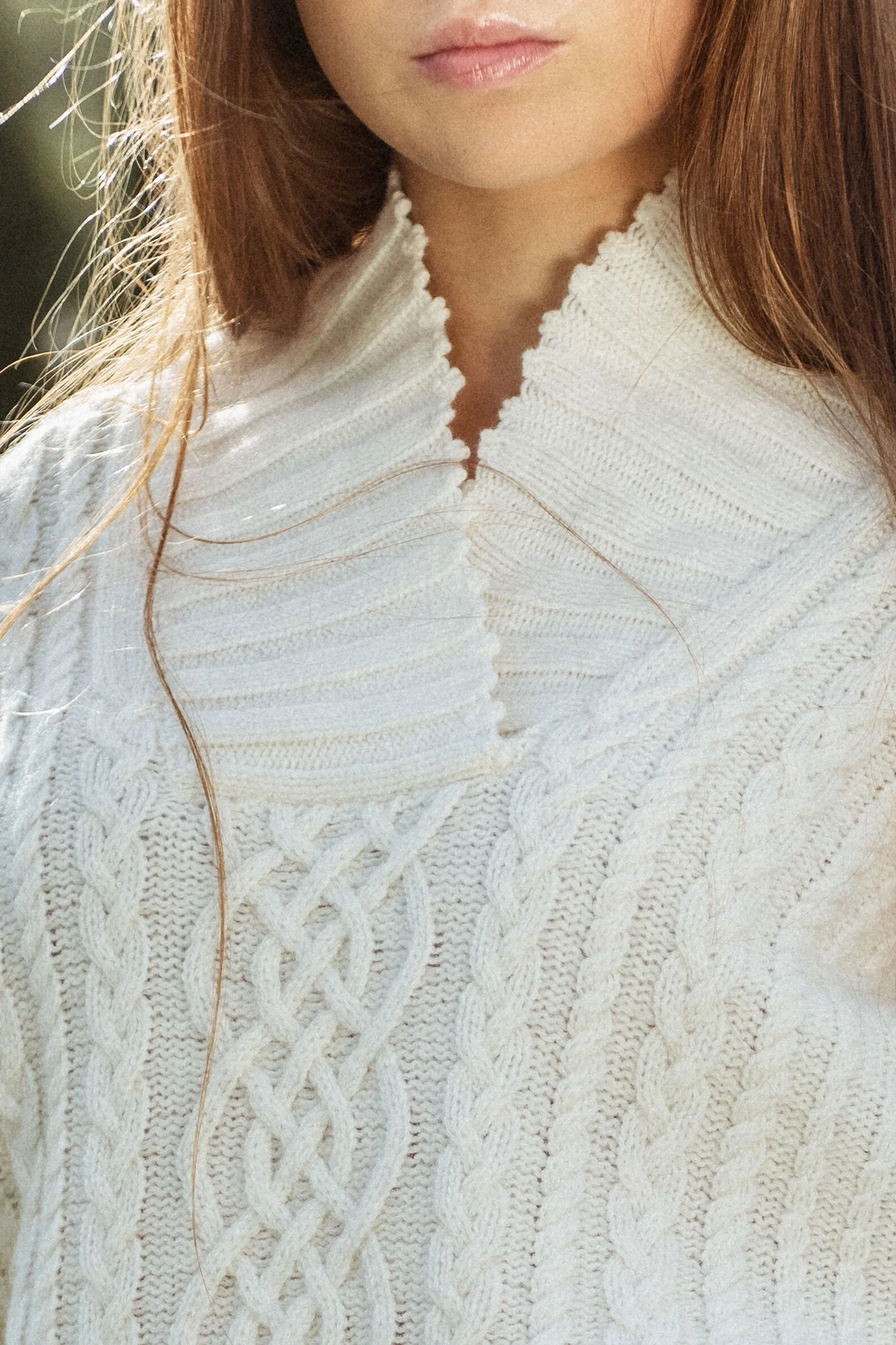 Keskmise paksusega sallkraega kampsun on soe ja väga pehme. Sallkrae servas on kaunistav pitsiline koerida. Kampsun on kootud üleni erinevate palmikute mustrilisena, ka seljaosa.