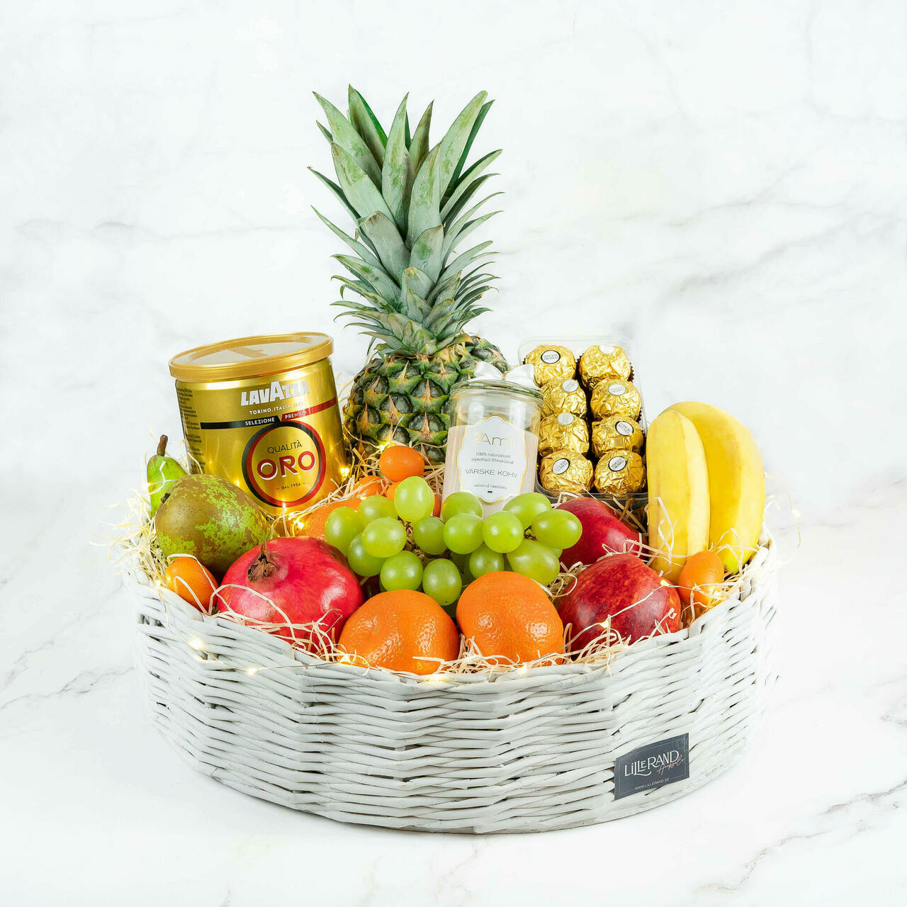 Külluslik kinkekorv, milles värsked ja tervislikud puuviljad, maitsev kvaliteetkohv, armastatud pralineed ja meeleoluloojaks kodumaine sojavahast küünal.