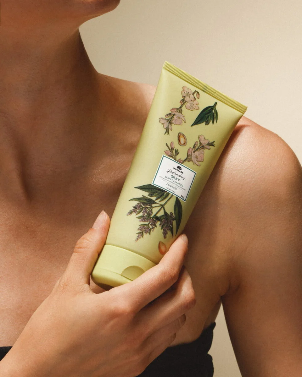 Kanna väike kogus dušigeeli niiskele nahale ja masseeri õrnalt ringjate liigutustega, kuni tekib õrn vaht. Loputa sooja veega.