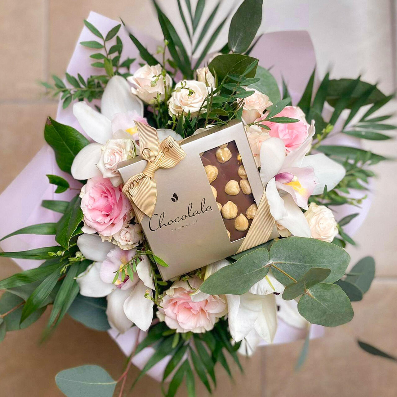 Meie floristid loovad helgetes värvitoonides romantilise lillekimbu. Kimpu on võimalik tellida koos Chocolala käsitöö šokolaadiga- pähklitega piimašokolaad, marjadega tumešokolaad või AnnAmi šokolaadisüdamega. Märgi maitse eelistus tellimuse info lahtrisse ostukorvi vaates. Veel suurema magusa valiku leiad SIIT.