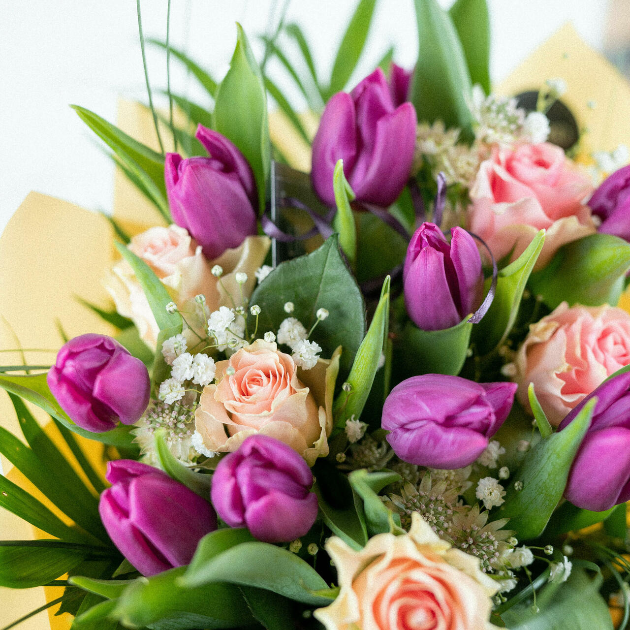 Loome Sulle kaunitest tulpidest, roosidest ja rohelisest taimmaterjalist rõõmu täis lillekimbu.