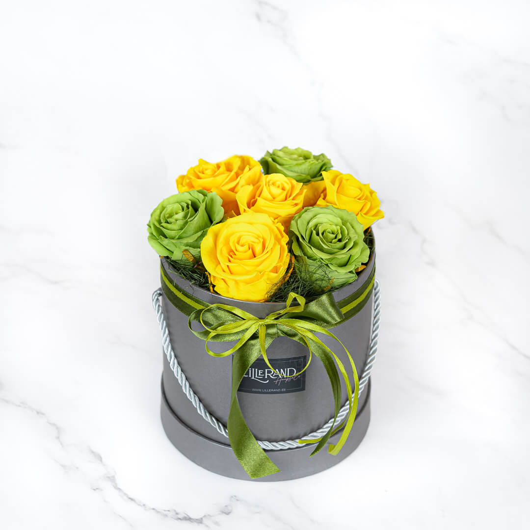 Särav seade koosneb kollastest ja rohelistest uinuvatest roosidest. Uinuvad roosid on ehtsad roosid, mis säilivad vähemalt 1 aasta.